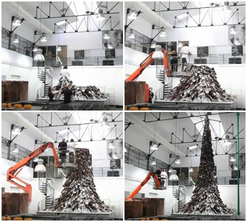나무 만드는 방법은 간단했다. 우선 완성할 나무의 기본 틀을 만들었다. 여기에 녹인 초콜릿과 녹이지 않은 초코바를 적절히 섞어 쌓아 올렸다. 나무 윗부분은 크레인으로 장식했다. 그 후 슈가 파우더를 뿌려 마무리했다.