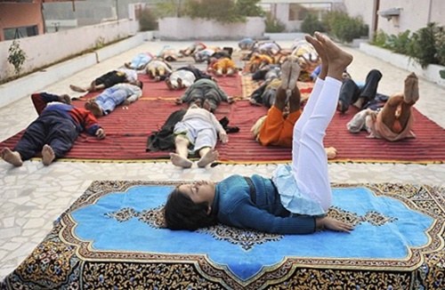 매일 새벽 5시 30분경 시작하는 30명의 학생들을 위해 요가 강습을 하고 있다.