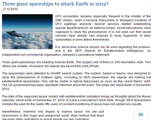 SETI는 미국 정부도 해당 사실에 대해 최근 보고를 받았다고 전하며 "우주선은 오는 2012년 12월 지구에 도착할 가능성이 높다"고 말했다. 이어 "우주선 관찰은 미국 알라스카에 위치한 HAARP 관찰 시스템(오로라 현상 연구)을 통해 발견됐다"고 전했다.