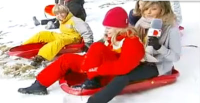 30일 외신에 따르면 스페인 미녀 리포터 리디아 카몬이 생방송 도중 눈썰매를 타고 리포트를 마무리 하려다 실수로 카메라맨까지 끌고 내려갔다고 전했다. 그녀가 눈썰매를 타기 전에 유선 마이크를 내려놓으려 했으나 마이크 선이 그만 눈썰매에 끼여 버린 것.