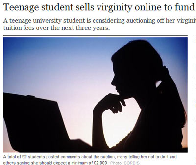 5일 영국 뉴스사이트 텔레그래프에 따르면 이 여대생은 지난 26일 영국 학생들이 즐겨찾는 사이트인 학생들의 방(The Student Rooms)에 '순결을 판매한다'는 내용의 글을 게재했다.