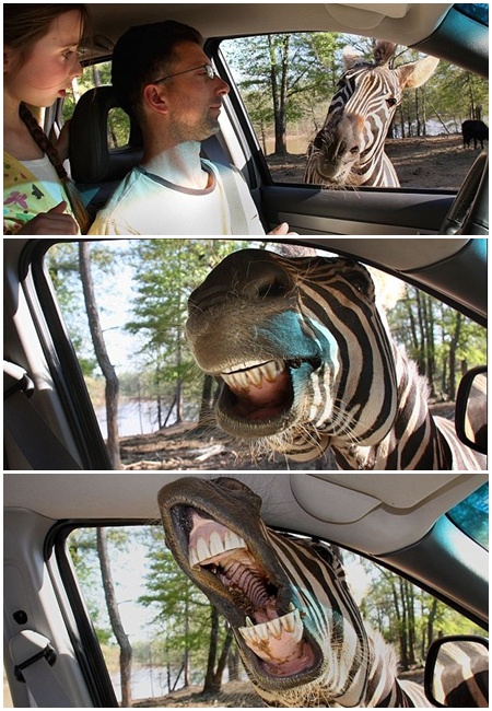 퀄러의 가족은 차를 타고 공원에 위치한 야생 동물을 구경했다. 이색 사진 포착은 이 순간에 나왔다. 얼룩말을 보기 위해 가까이 다가가자 얼룩말이 얼굴을 내민 것. 얼룩말은 차 안에 머리를 들이밀고 입을 살짝 벌린 채 이를 완전히 드러냈다.
