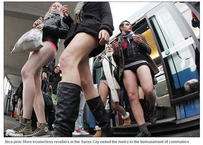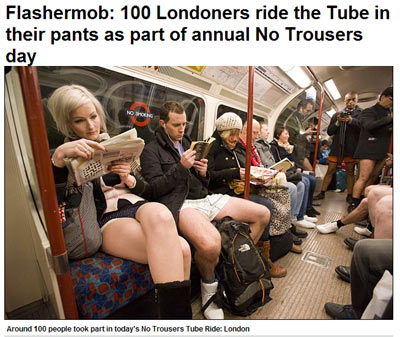 영국 데일리메일은 10일 런던의 한 지하철역에서 펼쳐진 '바지 안 입는날' 기념 이색 플래시몹을 보도했다. 이 행사는 지난 2002년 뉴욕의 한 단체에 의해 처음 시작된 이래 영국에서만 이번이 세 번째.