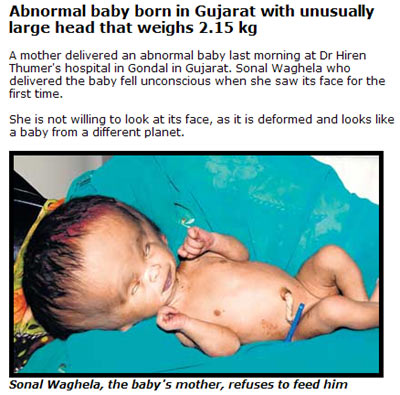 인도 언론매체 '미드데이'는 지난 10일 "인도 서부 구자라트주의 한 병원에서 외계인처럼 생긴 아기가 태어나 산모가 겁에 질렸다"고 전했다. 이 아기는 머리 무게만 무려 '2.15kg'에 달하며 몸보다 머리가 더 큰 기형적인 모습을 하고 있다.