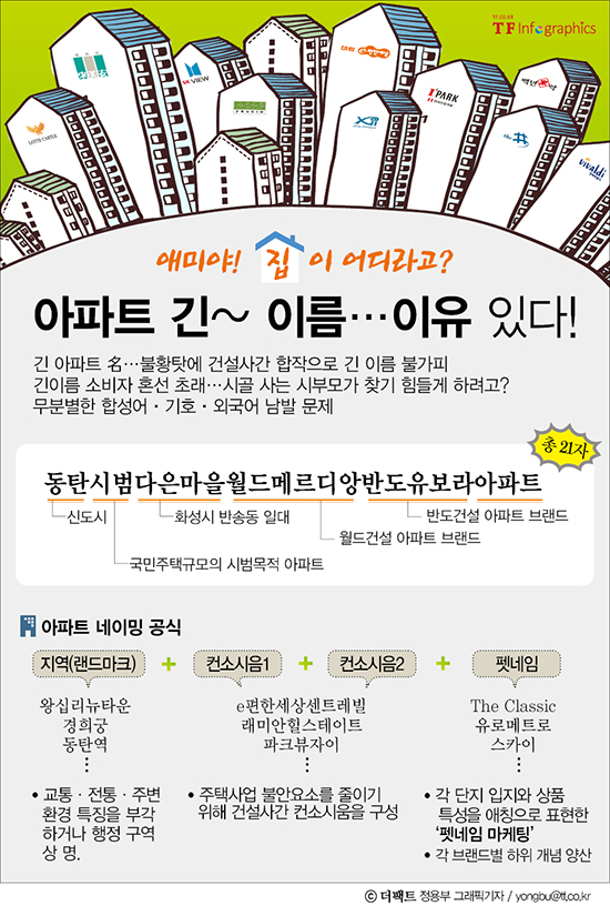 [더팩트ㅣ정용부 기자] 최근 아파트 이름이 길어지고 있다. 2000년대 초반 대형 건설사가 아파트를 브랜드화 시키면서 비교적 쉬운 이름이었으나 건설사간 분양전쟁이 치열해지면서 길고 복잡한 아파트 이름이 만들어지고 있다.