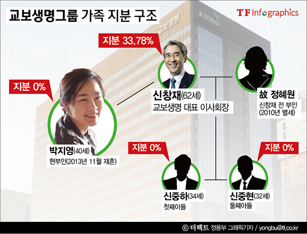 금융계 일각에서는 특히 신 회장이 현재까지 두 아들에게 교보생명 지분을 전혀 물려주지 않은 상황에서 새로운 법적 상속권자인 재혼녀(배우자)가 등장하자 경영권 승계와 관련해 갖가지 추측을 하기도 했다.