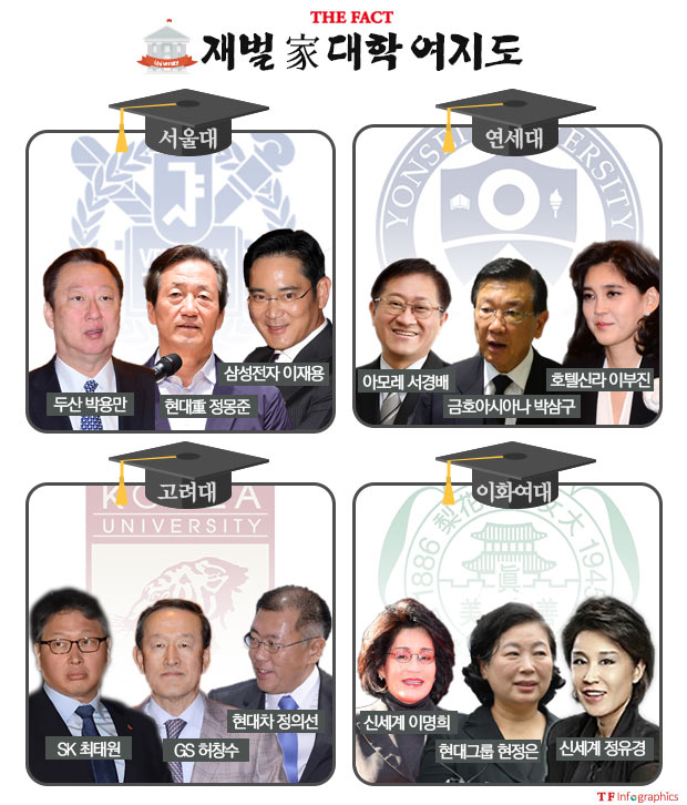 국내 경제를 좌지우지하는 재벌 총수 일가의 일거수일투족은 언제나 세간의 관심사로 꼽힌다. 그들이 입는 옷, 타는 차에 이어 혼맥 관계에 이르기까지 사람들의 눈과 귀를 집중시키는 재벌가 스토리 가운데 빠질 수 없는 것이 바로 '학력'이다. 굵직한 대기업 오너 일가 다수가 최상위 명문 고등학교와 대학교를 졸업하는 소위 '엘리트 코스'를 밟아왔다는 사실은 어느 정도 알려져 있지만, 실제로 이들이 어느 대학교를 나왔는지 구체적으로 알고 있는 사람은 많지 않은 것이 사실이다. <더팩트>에서 삼성, 현대차, SK 등 국내 주요 대기업 집단 오너 일가의 출신 대학교를 살펴보고 ▲ 동문 관계 ▲ 여성 경영인 학력 ▲ 국내파/국외파 ▲ 이색 전공 출신 등의 주제로 정리해봤다.