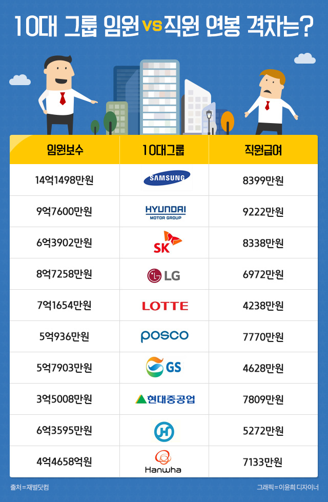 임원이 가장 많은 연봉을 받는 기업은 삼성그룹으로 등기임원 연봉은 14억1498만 원으로 나타났다. 직원 연봉은 8399만 원으로 임·직원 간 연봉 차이는 16.8배로 나타났다. 이어 LG그룹과 GS그룹은 각각 12.5배로 뒤를 이었고, 현대차그룹은 10.6배로 조사됐다. 그나마 SK그룹과 포스코그룹, 한화그룹은 각각 7.7배와 6.6배, 6.3배로 비교적 큰 격차를 보이지 않았다.