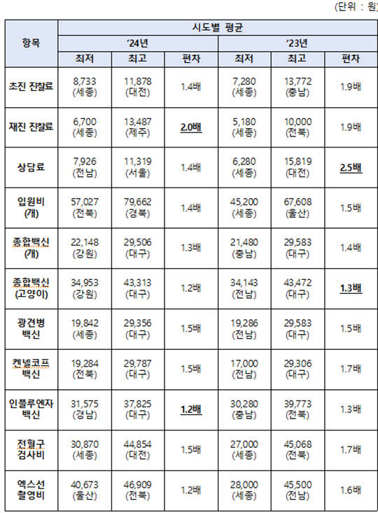 항목별로 보면 재진 초진 진찰료 평균 비용은 1만291원이다. 세종이 8733원으로 가장 낮았고 대전이 세종의 1.4배 수준인 1만1878원으로 가장 높았다.