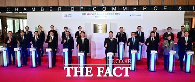 이날 현판식은 상의회관 로비에서 열렸다. 로비에 설치된 대형 화면에는 신라시대 번영을 상징하는 첨성대 화면이 등장해 눈길을 끌었다. 참석자들이 버튼을 누르자 커튼이 걷히며 '2025 APEC CEO 서밋' 로고가 새겨진 위원회 현판이 공개됐다.