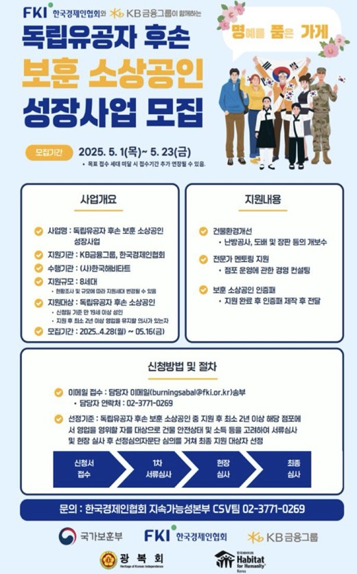 [더팩트ㅣ황지향 기자] 한국경제인협회(한경협)는 국가보훈부, KB금융그룹, 한국해비타트, 광복회와 함께 광복 80주년을 맞아 독립유공자 후손 소상공인의 성장을 지원하는 '명품가게 프로젝트'를 추진한다고 27일 밝혔다.