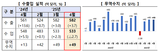 지난달 수출액은 역대 4월 중 최대 실적을 기록하며 3개월 연속 증가세를 보였다. 역대 4월 최대 실적인 2022년 4월 578억4000만달러보다 3억7000만달러가 늘었다.