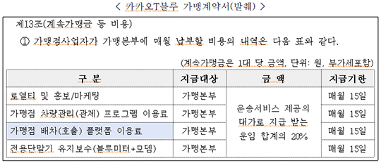 케이엠솔루션은 카카오 가맹 택시 기사들과 카카오T 앱을 통해 가맹기사에게 승객 호출을 배분하는 대가인 '가맹점 배차(호출) 플랫폼 이용료'를 비롯해 로열티 및 홍보·마케팅, 차량관리 프로그램 이용료, 전용단말기 유지보수 등 명목으로 가맹 택시 기사 전체 운임의 20%를 가맹금으로 일괄 징수하는 내용의 계약을 체결하고 있다.