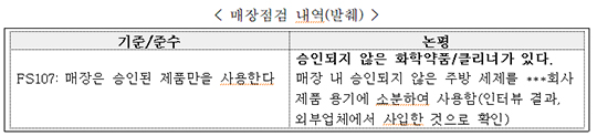 가맹점 점검시 해당 제품들을 사용하는지 확인하고 사용하지 않은 경우 가맹점 평가점수에서 감점했다. 실제로 다음 매장점검 내역과 같이 일부 가맹점은 지정된 주방세제가 아닌 다른 세제를 지정된 주방세제 용기에 소분해 사용하다가 적발돼 감점된 사실이 있다.