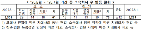 25일 공정거래위원회가 발표한 최근 3개월(5~7월)간 대규모기업집단 92곳의 소속회사 변동 현황에 따르면 소속회사는 5월 1일 3301개에서 지난 1일 3289개로 12개 감소했다.