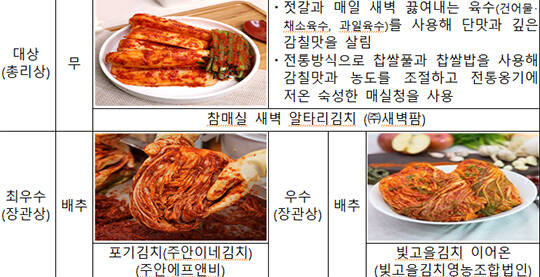 최우수상은 주안에프앤비의 ‘포기김치(주안이네김치)', 우수상은 빛고을김치영농조합법인의 '빛고을김치 이어온' 청원오가닉의 '포기김치(골드)' 주안에프앤비의 '총각김치(주안이네김치)', 장려상은 드림엘푸드의 '콕집어콕 콕포기김치' 임진강김치의 '미금치 율무 보쌈김치' 농협조공법인 연천지사(전곡농협)의 '오색소반 포기김치' 솜씨가 주식회사의 '솜씨가 신토불이 총각김치'가 각각 선정됐다.