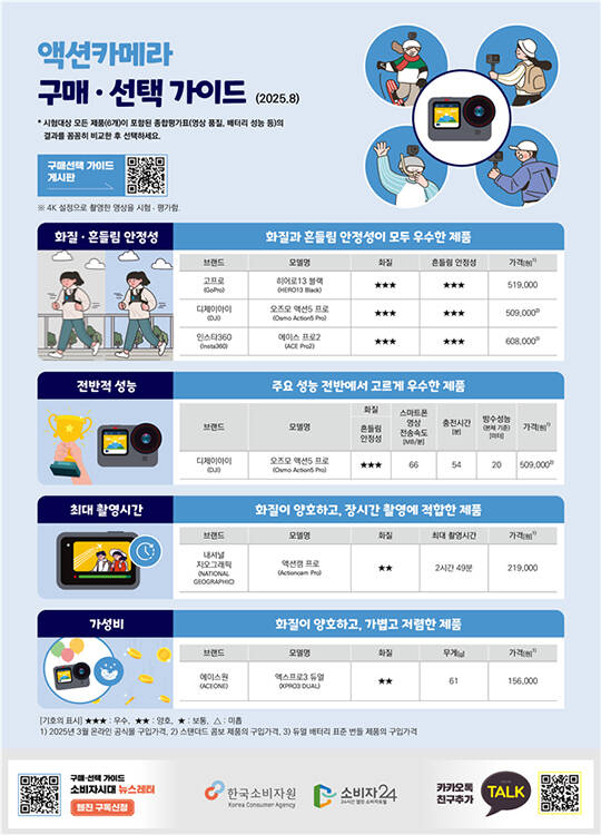 소비자원은 "액션카메라는 사용 목적과 환경에 따라 필요한 기능이 다르므로 화질⋅흔들림 안정성⋅배터리 성능⋅보유 기능 등을 비교한 후 선택하는 것이 바람직하다"고 조언했다.