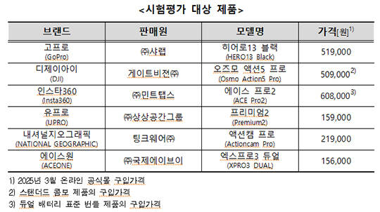 색재현·해상력 등 6개 항목을 종합 평가한 화질과 걷거나 뛰면서 촬영한 영상의 흔들림 안정성은 히어로13 블랙(고프로), 오즈모 액션5 프로(DJI), 에이스 프로2(인스타360) 등 3개 제품이 상대적으로 우수했다.