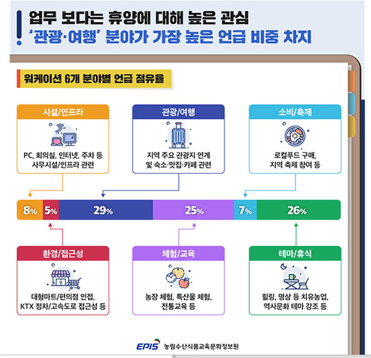 최근 5년간 온라인 데이터를 △시설·인프라 △환경·접근성 △관광·여행 △체험·교육 △소비·축제 △테마·휴식 등 6개 분야로 구분해 분석한 결과 일보다는 휴양 분야에 대한 관심이 상대적으로 높게 나타났다.