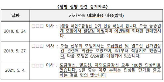 이번 합의는 2016년 12월부터 2022년 2월까지 약 5년 동안 대표자 및 영업 임·직원 간의 모임을 통해 이뤄졌다. 이를 통해 아연도금철선 등 4개 제품의 단가 인상 시기와 폭을 결정했다. 각 사업자는 거래처에 단가 인상 공문을 송부하거나 구두로 통보하는 방식으로 합의내용을 실행했다.