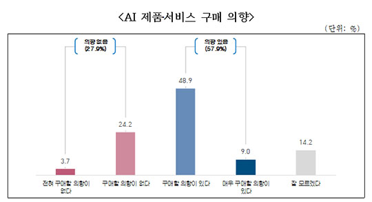 소비자 3000명을 대상으로 인식조사를 실시한 결과 절반 이상인 57.9%가 AI 기술이 적용된 제품이 일반 제품보다 비싸더라도 구매 의향이 있다고 답했다. 구매 의사를 밝힌 소비자는 일반 제품보다 평균 20.9%의 추가 가격을 지불할 의향이 있다고 응답했다.