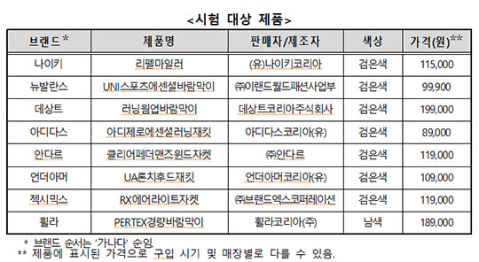 바람이 부는 환경에서 체온을 잘 유지하는 정도인 체온 유지성은 나이키·데상트·안다르·언더아머 등 4개 제품이 상대적으로 양호했다.