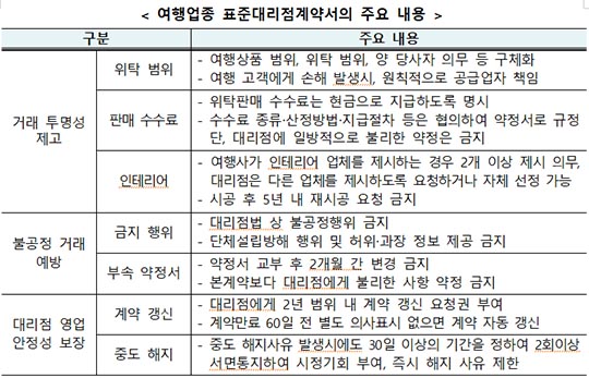 이번에 마련된 표준계약서는 총 21개조 68개항으로, 여행사와 대리점 간 계약에서 △거래관계 투명성 제고 △불공정 거래관행 개선 및 예방 △대리점 영업의 안정성 보장 등 대리점 권익 보호를 위한 표준적인 거래조건을 규정했다.