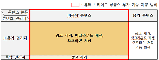비음악 콘텐츠에 대한 광고 제거만 제공되며, 비음악 콘텐츠 중에서도 음악 권리자가 권리를 보유하는 경우 백그라운드 재생·오프라인 저장 기능은 부여되지 않는다.