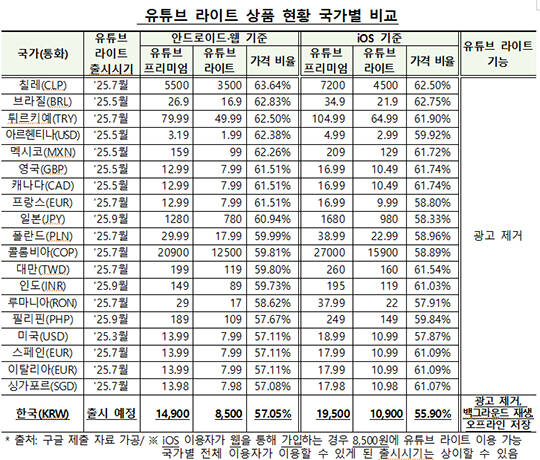 유튜브 라이트는 2025년 3월 이후 해외 19개 국가에 본격적으로 출시됐는데, 유튜브프리미엄 가격 대비 유튜브 라이트의 가격 비율을 기준으로 우리나라에서의 가격 수준은 이들 국가 중 가장 낮은 수준이다.
