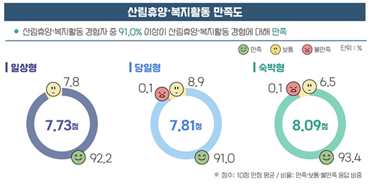 산림 휴양·복지활동 만족도에서 경험자 중 91% 이상이 만족한다고 응답했다.