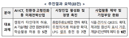 공정위는 시장 분석과 사업자단체·정책 수용자 의견 수렴 및 관계 부처 협의를 거쳐 AI·정보통신기술(ICT)·친환경·고령 친화 산업을 촉진하는 방안 5건, 시장 진입 활성화 및 경쟁 친화 방안 7건, 사업 제약·기업 부담 완화 방안 10건 등 모두 22건의 규제 완화를 추진하거나 완료했다.