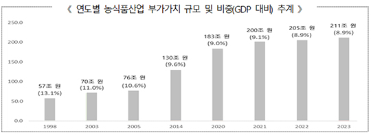 연구 결과에 따르면 2023년 기준 농식품산업 부가가치는 약 211조원, GDP 대비 8.9% 수준으로 추계됐다.