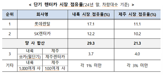 공정위에 따를면 단기 렌터카 시장에서 롯데렌탈과 SK렌터카는 각각 1·2위 사업자 지위를 확고히 유지해 왔다. 양 사의 시장점유율은 2024년 말 기준 각각 29.3%(내륙), 21.3%(제주)로 나타난다. 반면, 나머지 경쟁사들은 대부분 영세한 중소 사업자로서 각각의 시장점유율은 미미한 수준이다.