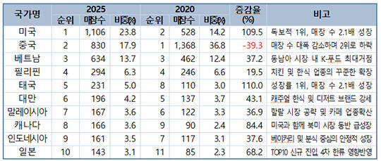 2020년 매장 수 1368개로 독보적 1위였던 중국은 현지 경쟁 심화 여파로 2025년 830개로 크게 감소했다. 반면, 미국 시장은 5년 전에 비해 2배 이상 성장한 1106개 매장을 확보했다. 미국 등 외식 선진국에서 치킨과 제과제빵 등을 앞세워 실질적인 수익을 거두는 '질적 성장기'에 진입했다고 전문가들은 분석했다.