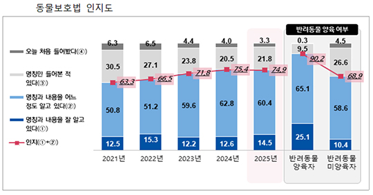 국민 5000명을 대상으로 온라인으로 실시한 '2025년 동물복지에 대한 국민 의식 조사'에서 동물복지 관련 법·제도 인지도는 74.9%로 전년(75.4%)과 비슷한 수준을 유지했다. 2022년 66.5%, 2023년 71.8%, 2024년 75.4%, 지난해 74.9% 등으로 높아지는 추세다.