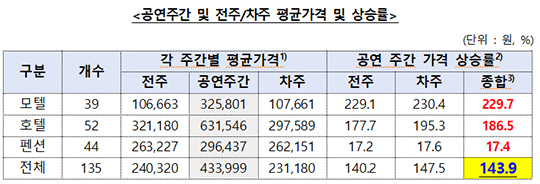 숙소 유형별로는 모텔의 상승폭이 가장 컸다. 모텔은 공연 주말 평균 32만5801원으로 평시 대비 3.3배(229.7%) 가까이 올랐다. 호텔은 63만1546원으로 2.9배(186.5%) 상승했다. 펜션은 29만6437원으로 1.2배(17.4%) 올라 상대적으로 상승폭이 낮았다.