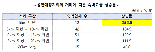 공연예정지와의 거리가 요금 상승에 영향을 미쳤다. 2022년 10월에 BTS 공연이 있었던 부산아시아드 주경기장 반경 5㎞ 이내 숙소의 경우 공연 주말 요금이 평시 대비 3.5배(252.6%) 상승했다. 5~10㎞ 구간은 184.5%, 10~15㎞ 구간은 122.9% 각각 올랐다. 20㎞ 이상 떨어진 숙소의 상승률은 46.6%로 상대적으로 낮았다.