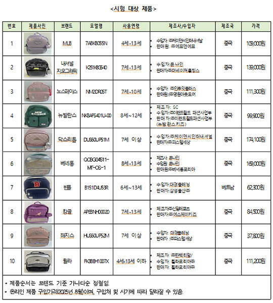 MLB '애슬레저 스트링 경량백팩', 내셔널지오그래픽 '볼즈 백팩', 뉴발란스, 베네통 '블링 무빙 책가방', 캉골 '라니 백팩 PE 0002' 등 5개 브랜드 제품은 수입자를 제대로 표시하지 않았다. 닥스리틀 '뉴 스팽글 책가방'은 제조자 확인이 어려운 것으로 드러났다.