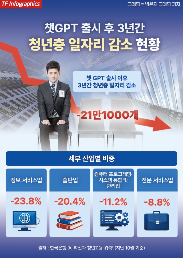 한국은행의 보고서 역시 이를 뒷받침한다. 한국은행이 지난해 10월 발표한 보고서에 따르면 챗GPT 등장 이후 지난 3년간(2022년 7월~2025년 7월) 정보 서비스업(-23.8%), 출판업(-20.4%), 컴퓨터 프로그래밍·시스템 통합 및 관리업(-11.2%) 등 AI 활용도가 높은 산업에서 청년 고용이 일제히 위축됐다.