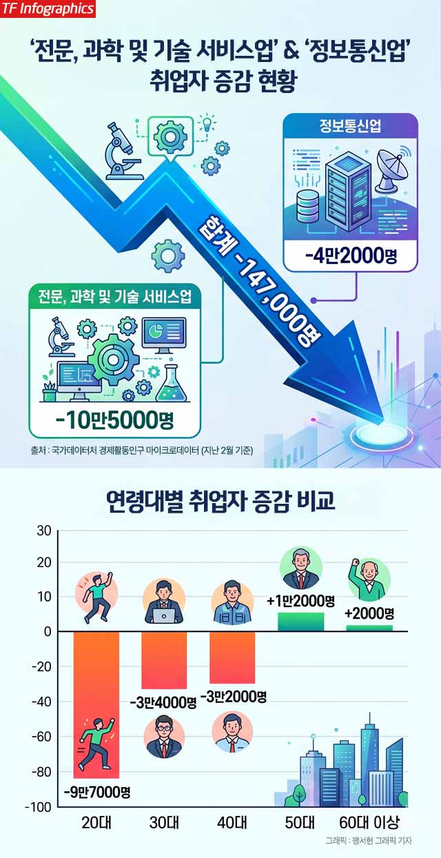 더팩트가 20일 국가통계포털(KOSIS) 마이크로데이터를 분석한 결과 지난 2월 기준 '전문·과학 및 기술 서비스업'과 '정보통신업'의 취업자 수는 전년 같은 달 대비 약 14만7000명 급감했다. 두 업종 취업자가 동시에 줄어든 것은 코로나19 팬데믹 직후인 2021년 이후 5년 만이다. 감소 규모는 2013년 산업분류 개편 이후 17년 만에 가장 컸다. 해당 업종은 상대적으로 AI 노출도가 큰 분야로 꼽히는 만큼 AI 도입이 실질적 고용시장 변동을 일으키고 있다는 방증이다.