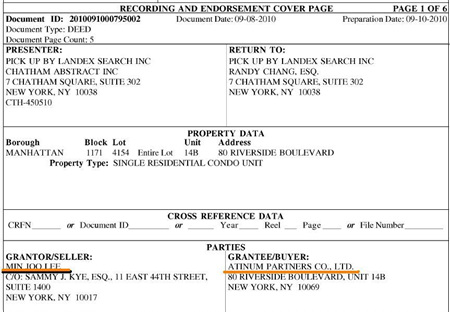 이 회장은 지난 8일 뉴욕 맨해튼소재 80 RIVERSIDE BLVD의 RUSHMORE CONDO 14B호를 에이티넘파트너스 [ATINUM PARTNERS CO LTD ]에 305만 달러(한화 약 35억원)에 매도했습니다.