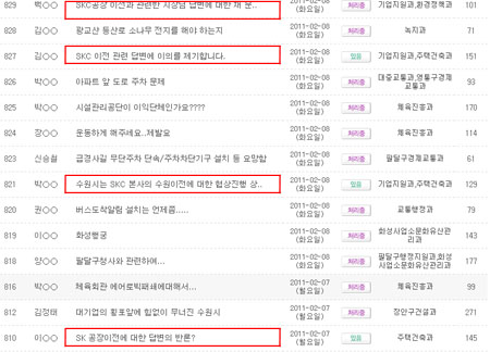 최씨 외에도 분양을 계약한 입주 예정자들은 수원시에 거센 항의 중이다. 300여건이 넘는 민원을 넣으며 ‘대규모 아파트 단지에 화학공장이 말이 되냐’는 등 SKC 본사 및 화학공장 증설에 동의한 수원시를 비난했다. 또 분양 당시 SK건설 측에서 홍보한 ‘기대이상의 +α가 화학공장 증축일 줄 몰랐다’며 울분을 토했다.
