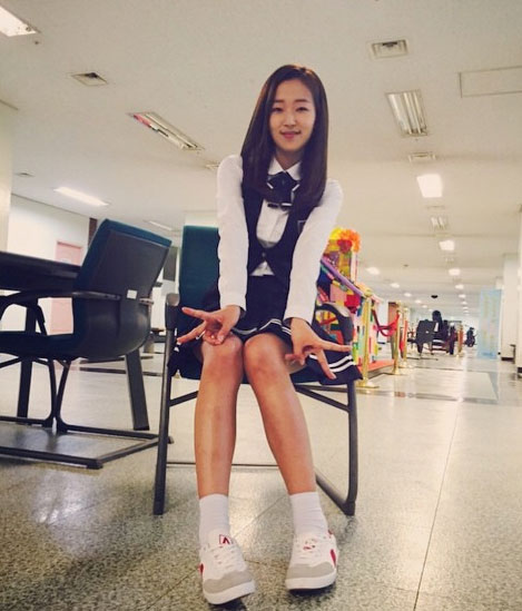 사진 속 조수향은 KBS2 '후아유-학교 2015' 촬영 현장으로 보이는 곳에서 교복을 입고 다소곳이 앉아서 수줍게 손가락으로 '브이'를 그리고 있다.