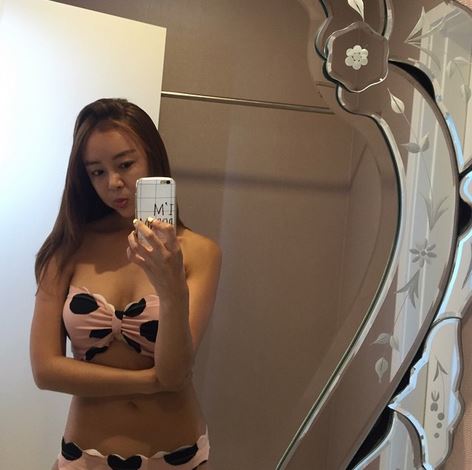 사진 속 백보람은 분홍색에 검정 도트 무의 비키니를 입고 볼풍선으로 귀여운 표정을 짓고 있다.