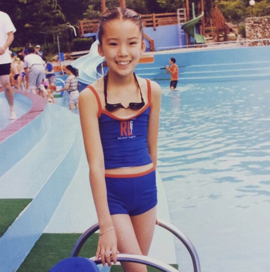 사진 속 아이린은 파란색 수영복을 입고 어린 나이임에도 길쭉한 팔다리를 자랑하고 있다.