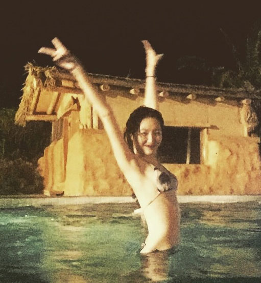 사진 속 김새롬은 손바닥만한 비키니로 가슴을 가린 채 즐거운 표정으로 물놀이를 하고 있다.