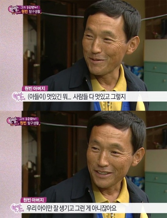 당시 원빈 아버지는 원빈에 대해 "아들이 멋있긴 뭐…사람들 다 멋있다"라며 "우리 아이만 잘생기고 그런 게 아니지 않냐"고 말해 눈길을 끌었다.