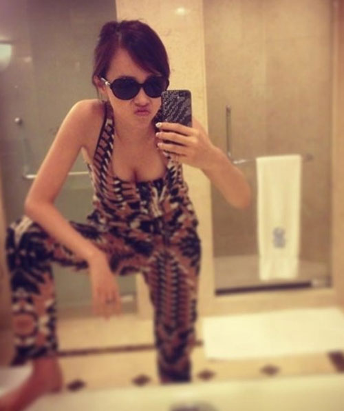 사진 속 아유미는 점프수트를 입고 완벽한 글래머를 뽐냈다. 아유미는 다리 한 쪽을 선반에 올리고 입술을 쭉 내민채 포즈를 취하고 있다.