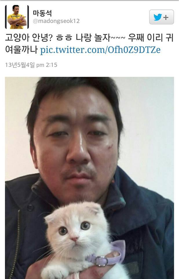 마동석은 과거 트위터에 "고양아 안녕? 나랑 놀자~우째 이리 귀여울까나"라는 말과 함께 한 장의 사진을 공개했다. 공개된 사진에는 마동석이 새끼 고양이를 들고 카메라를 응시하고 있다.