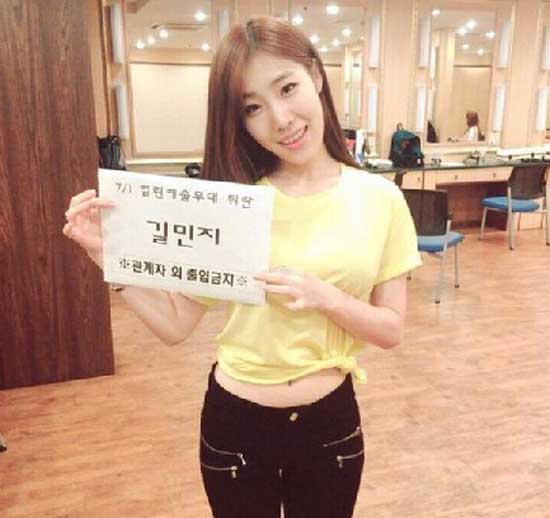 사진 속 길민지는 노란색 배꼽티에 검정색 스키니진을 입고 자신의 이름이 쓰여진 A4 용지를 들고 포즈를 취하고 있다.